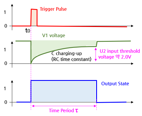 이 회로는 전원이 켜진 상태에서는 안정된 출력 상태를 유지하다가, 외부에서 입력되는 트리거 신호가 들어오면 출력이 일정 시간 동안 다른 상태로 변화한 후, 다시 원래 상태로 돌아옵니다.