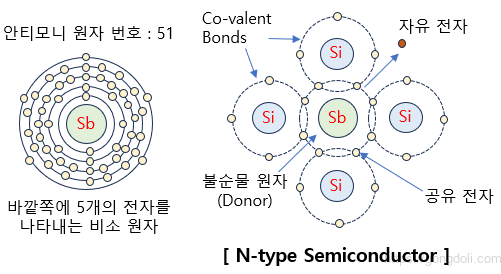 안티몬(Sb)와 인(P)은 실리콘 반도체에 자주 첨가되는 다섯 개의 원자입니다.