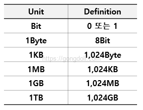 - 비트: 비트는 가장 작은 데이터 단위로, 컴퓨터가 논리 연산을 수행하는 기본 단위입니다.