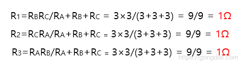 델타 와이 변환 방정식에 대입해서 계산해 보면,