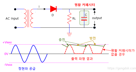 교류 전압을 정류하여 직류 전원을 제공할 때 종종 전압의 변동이나 리플이 없는 “안정적”이고 연속적인 직류 전압을 원합니다.