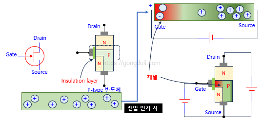 이로 인해 P 층 아래에 N 형 반도체 층이 형성되며, 이를 “채널”이라고 합니다.